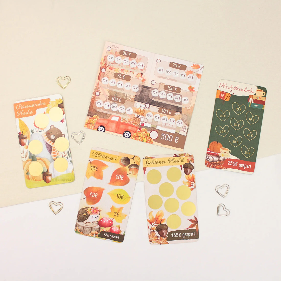 Herbst Spar-Challenge Set - mit Motivkarten zum Freirubbeln, Aufklappen & Sparen