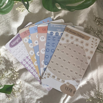 Unsere Spar-Challenges wecken deinen Ehrgeiz und machen Sparen motivierend! Setze dir Ziele wie den nächsten Urlaub oder das neue iPhone und erreiche sie spielerisch. Jede Challenge zeigt dir, welche Summe dich erwartet, wenn du durchhältst. Beobachte durch den Zipperumschlag deines Budget Binders, wie dein Geld wächst. Starte motiviert und werde spielerisch zum Sparfuchs!