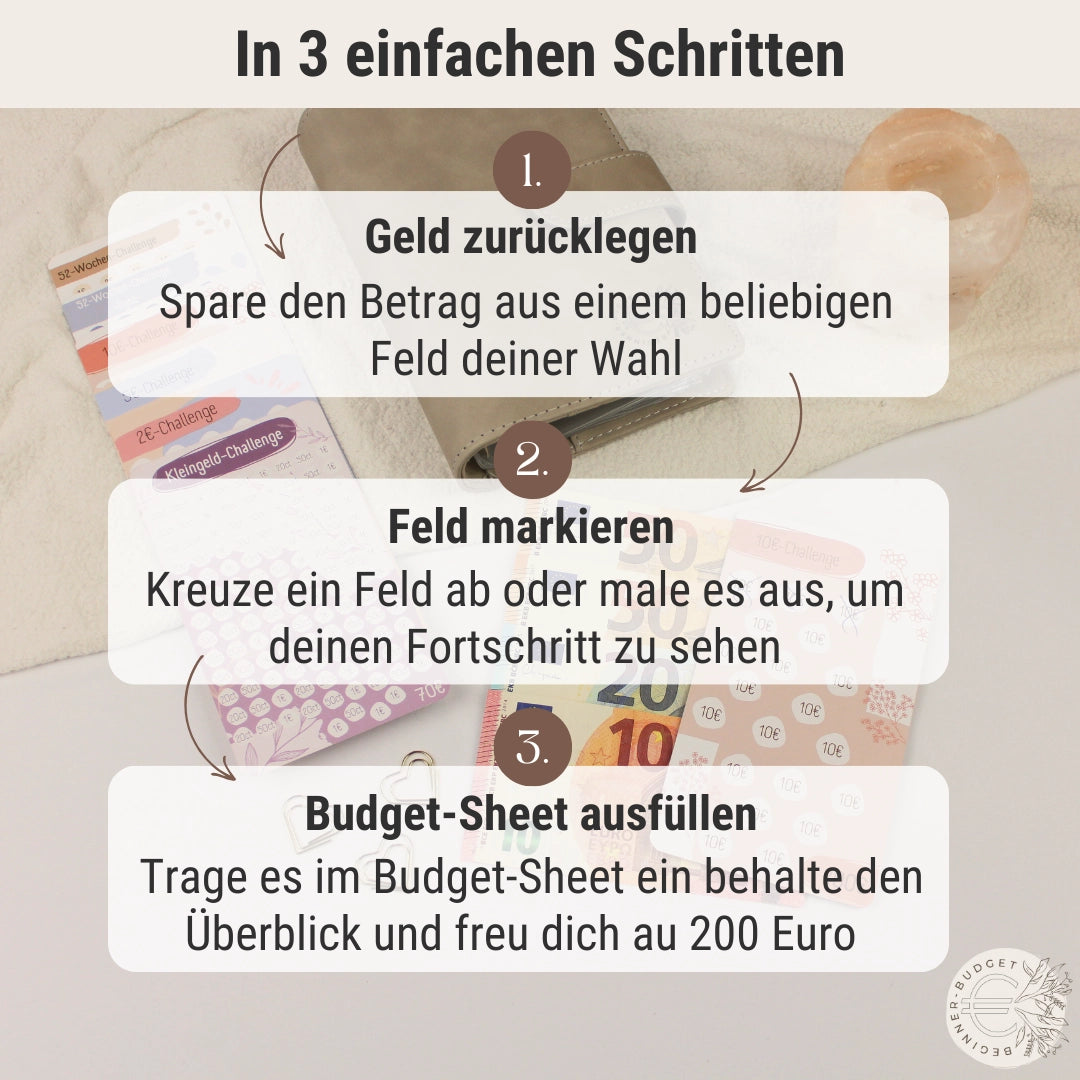 Du möchtest in den Urlaub fahren oder dir das neue iPhone kaufen? Mit dieser Spar-Challenge kommst du deinem Ziel näher und wirst spielerisch zum Sparfuchs. Unten rechts siehst du sofort welche Summe auf dich wartet, wenn du durchhältst. Du kannst durch den Umschlag förmlich zusehen, wie dein Geld mehr wird und du sparst mit der Challenge insgesamt 200€ an.