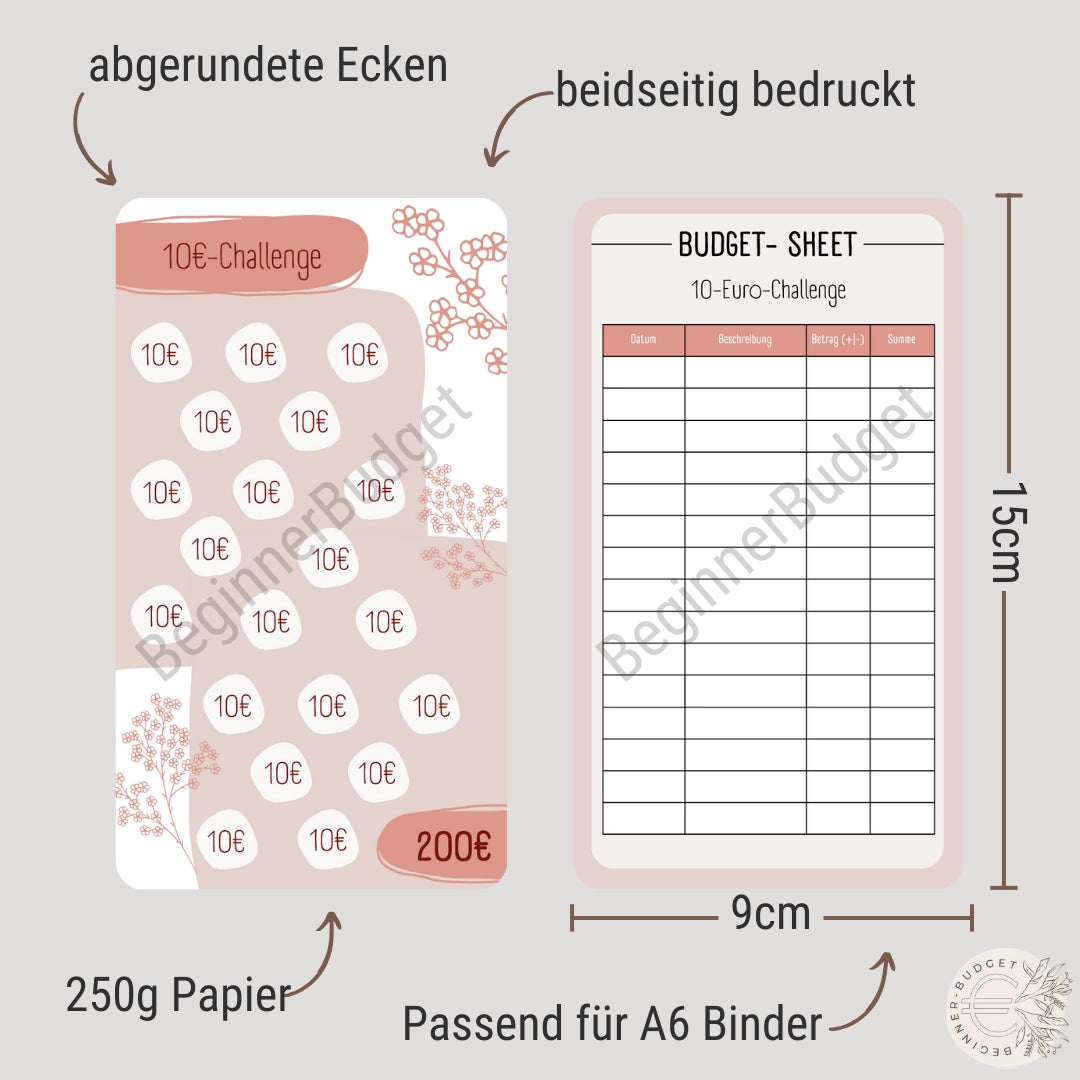 Die Challenge wird auf hochwertigen 250g Papier gedruckt und passend für die Zipperumschläge in deinem Budget Binder Personal zurechtgeschnitten (ca. 9x15cm).