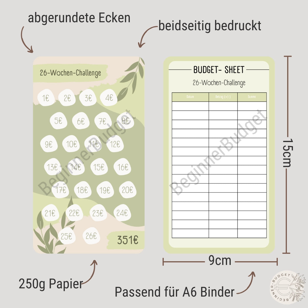 Die Challenge wird auf hochwertigen 250g Papier gedruckt und passend für die Zipperumschläge in deinem Budget Binder Personal zurechtgeschnitten (ca. 9x15cm).