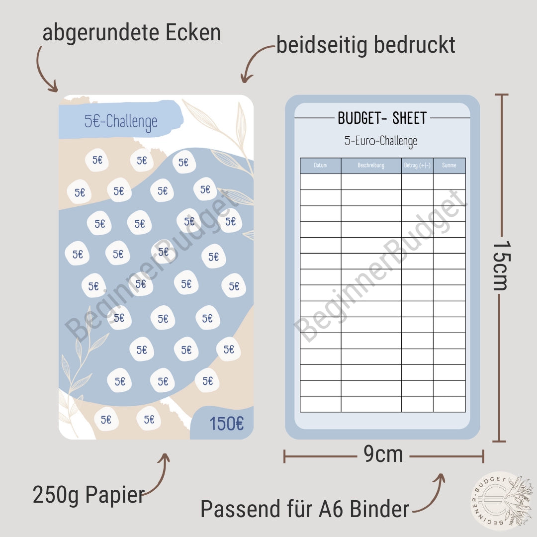 Die Challenge wird auf hochwertigen 250g Papier gedruckt und passend für die Zipperumschläge in deinem Budget Binder Personal zurechtgeschnitten (ca. 9x15cm).