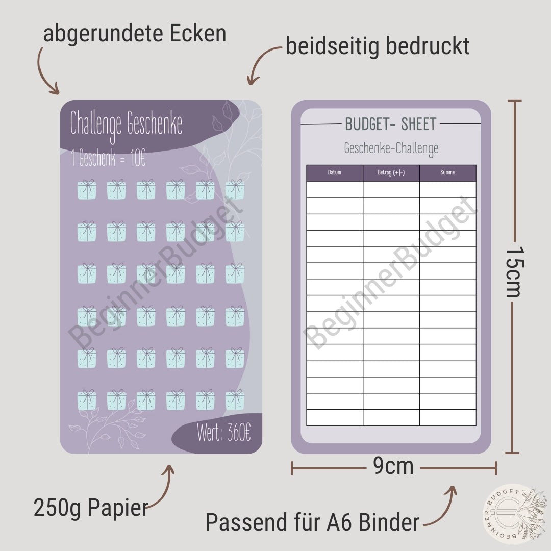 Die Challenge wird auf hochwertigen 250g Papier gedruckt und passend für die Zipperumschläge in deinem Budget Binder Personal zurechtgeschnitten (ca. 9x15cm).