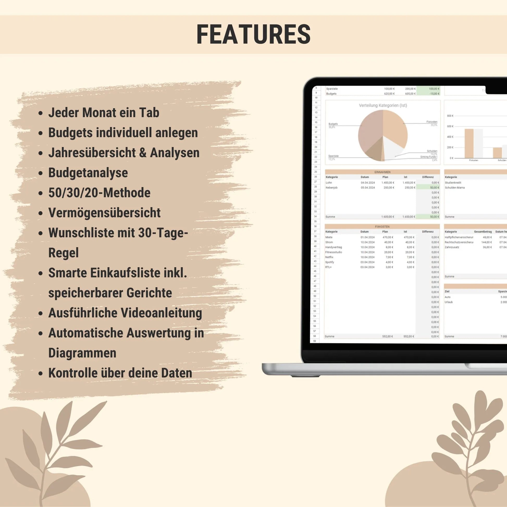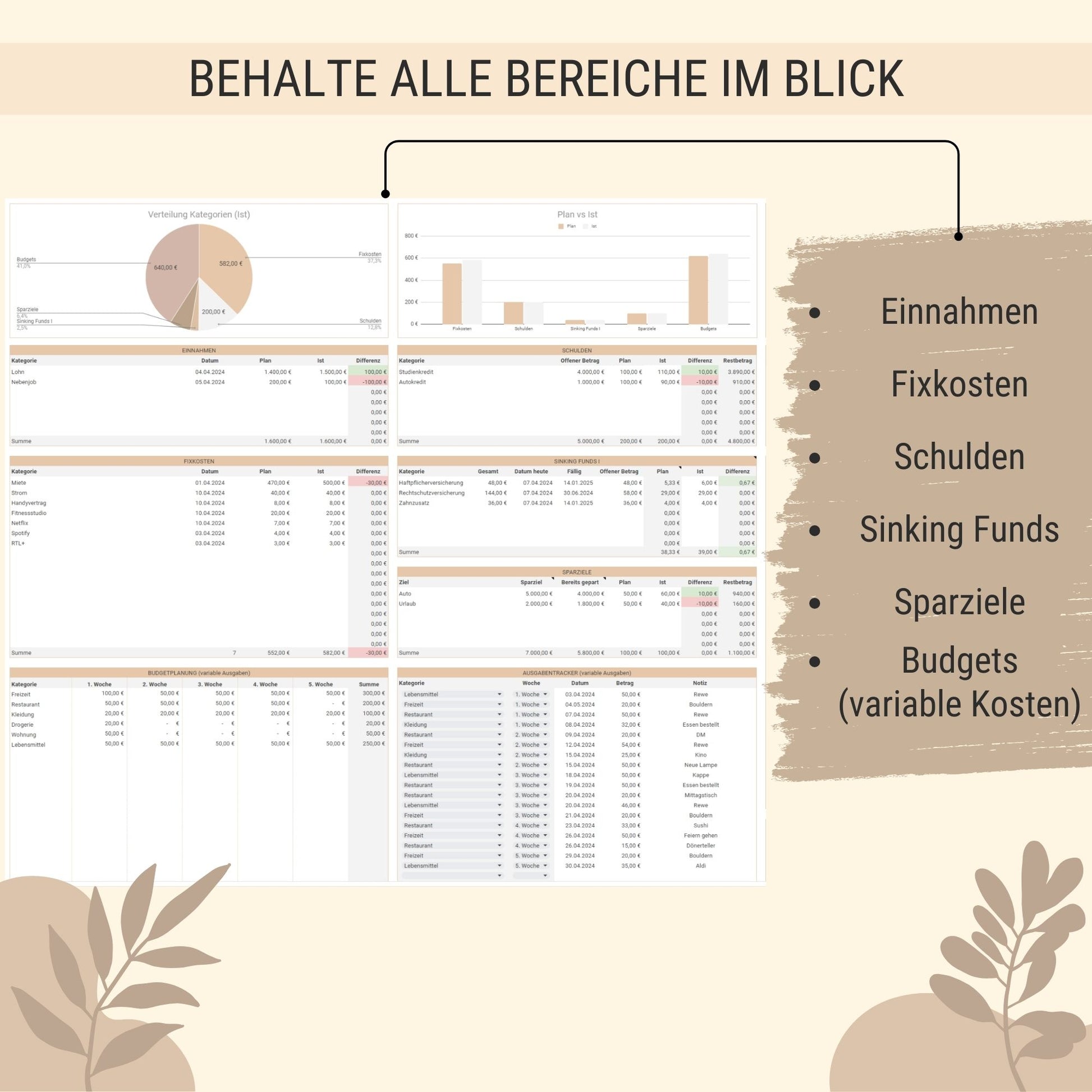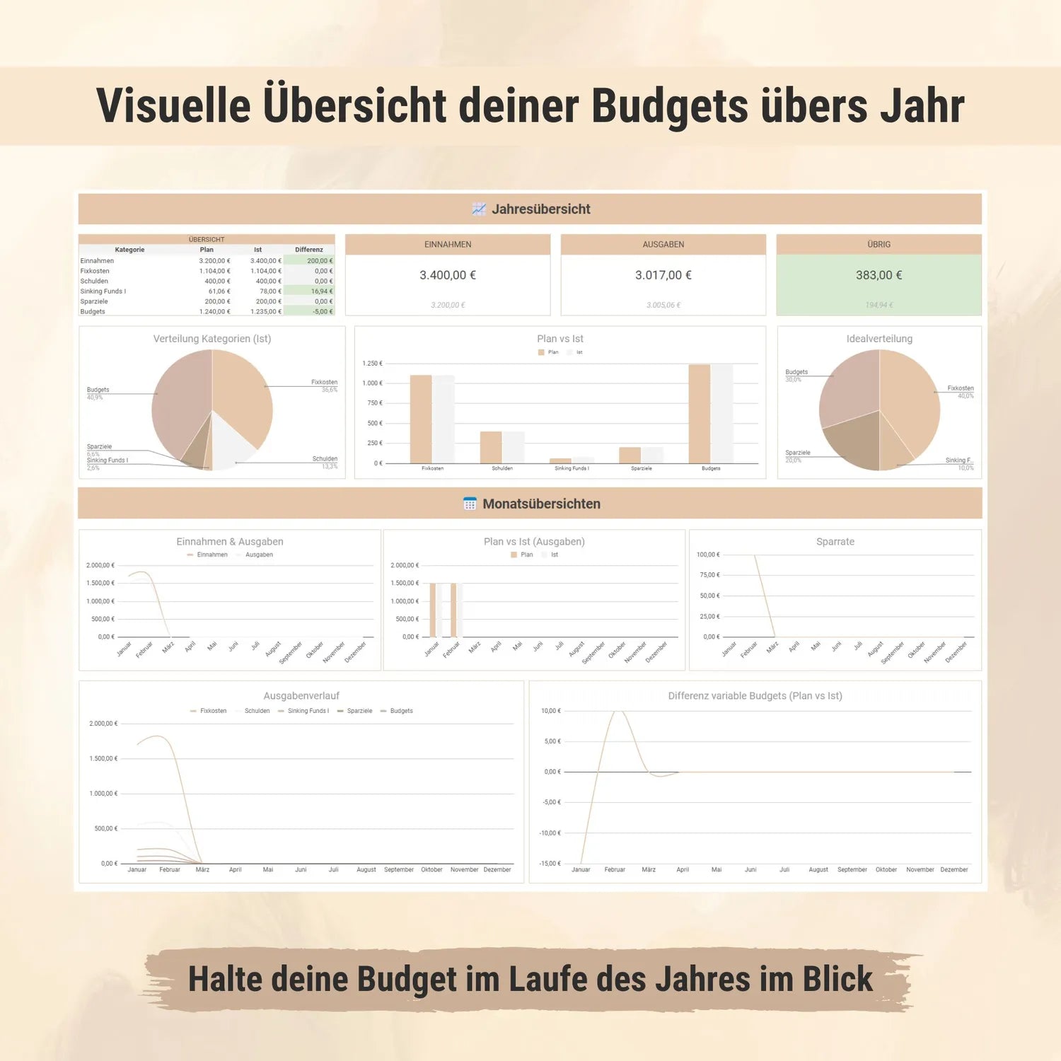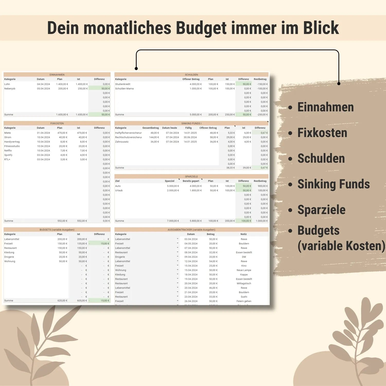 Behalte jederzeit die volle Kontrolle über deine Finanzen mit unserem Digitalen Budget Planer, speziell entwickelt für Excel & Google Sheets. Diese praktische Ergänzung zu deinem physischen Budgetplaner bietet dir einen umfassenden Überblick über deine monatlichen Einnahmen, Ausgaben, Schulden, Sinking Funds, Sparziele und Budgets für variable Kosten.