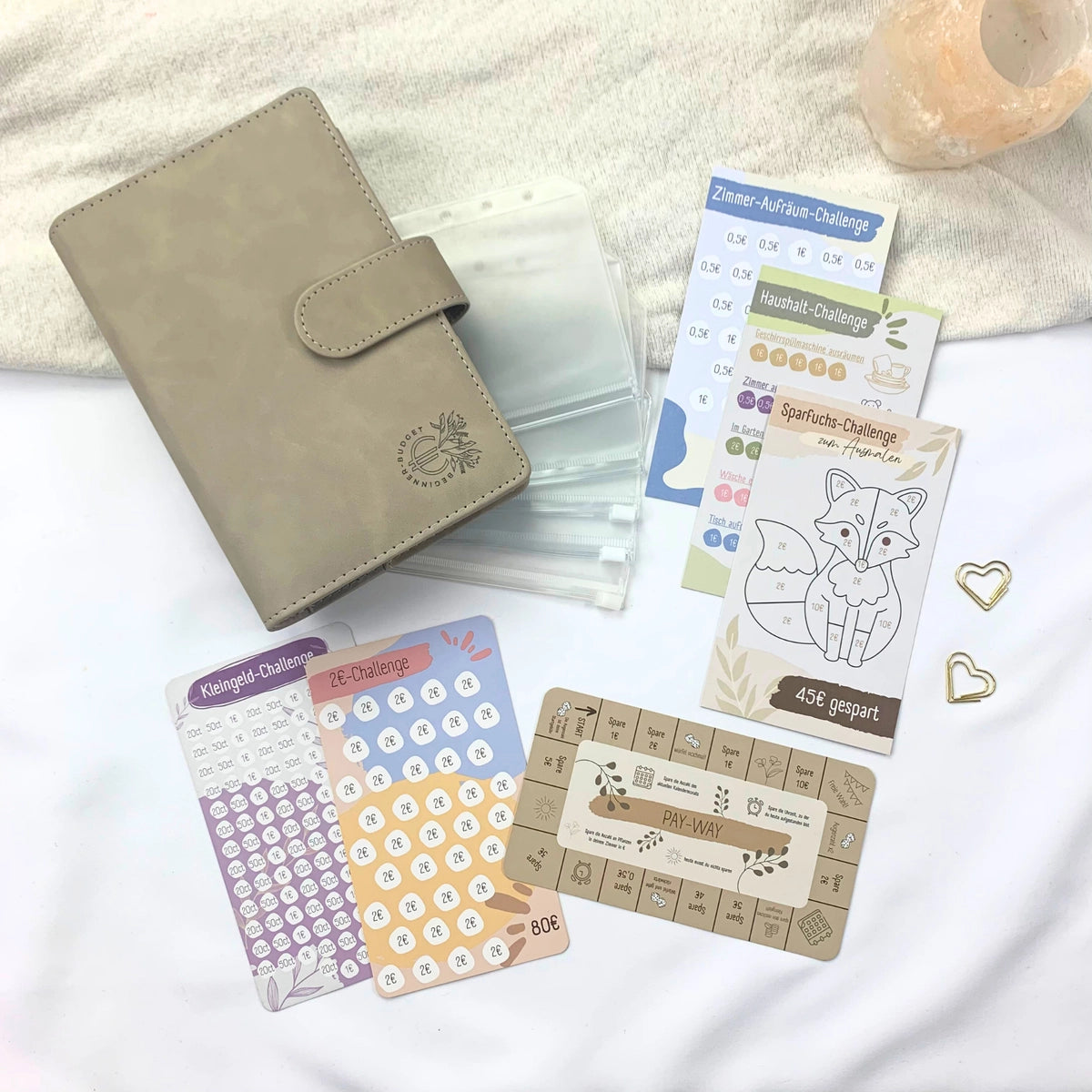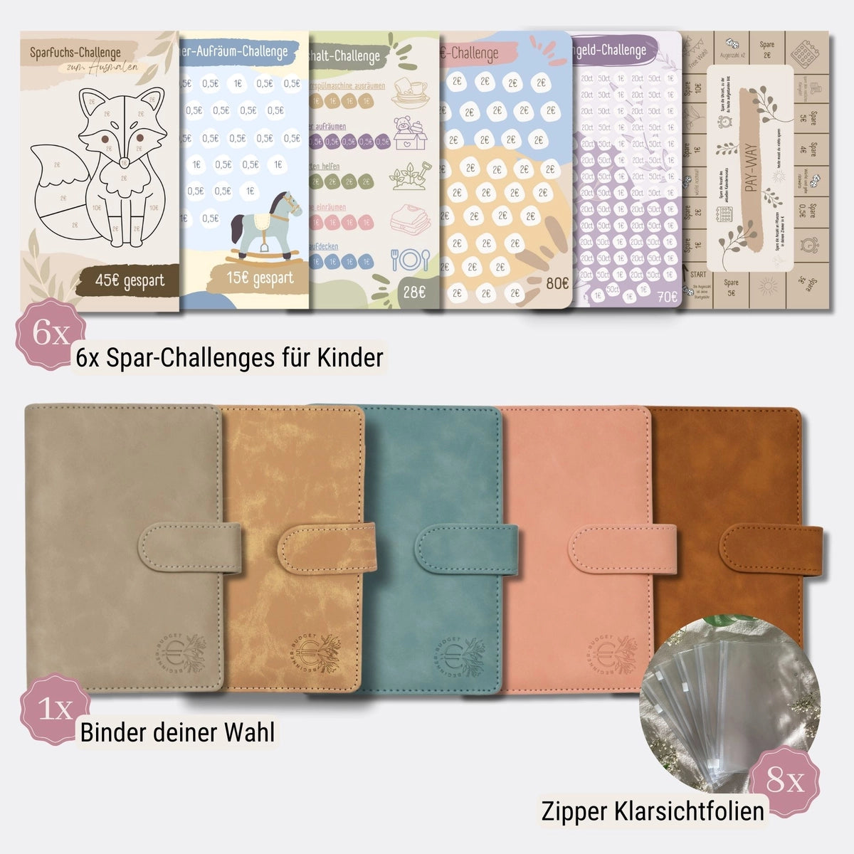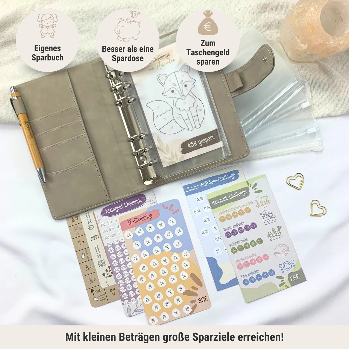 Unser Kinder-Spar-Bundle macht Sparen zu einem Abenteuer! Mit einem hochwertigen A6 Binder und 6 liebevoll gestalteten Spar-Challenges lernen Kinder spielerisch den Umgang mit Geld. Jede Challenge, wie die Zimmer-Aufräum-Challenge oder die Haushalts-Challenge, fördert wichtige Werte wie Verantwortungsbewusstsein, Zielstrebigkeit und den Spaß am Sparen.