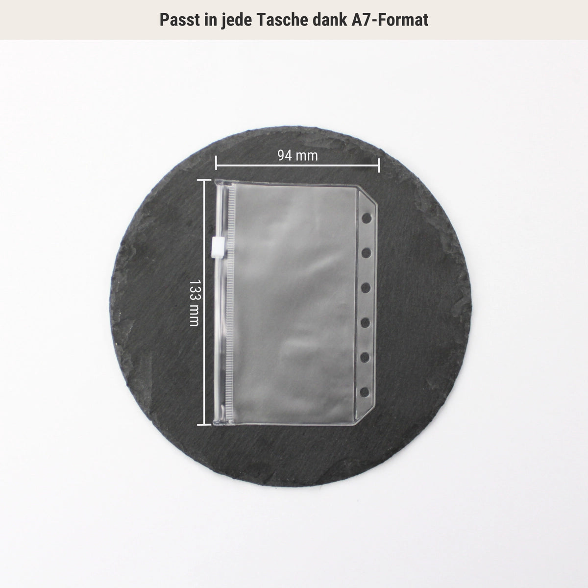 Unsere A7 Zipperumschläge sind die perfekte Ergänzung für deinen A7 Binder. Sie eignen sich ideal, um deine Budgets übersichtlich zu verwalten – von Sparzielen über variable Ausgaben bis hin zu Rücklagen. Die stabilen Reißverschlüsse sorgen dafür, dass dein Geld und kleine Belege sicher verstaut bleiben. Dank des kompakten A7-Formats sind sie leicht zu transportieren und passen perfekt in deine Tasche. Perfekt für Cash Stuffing und ein müheloses Finanzmanagement unterwegs!