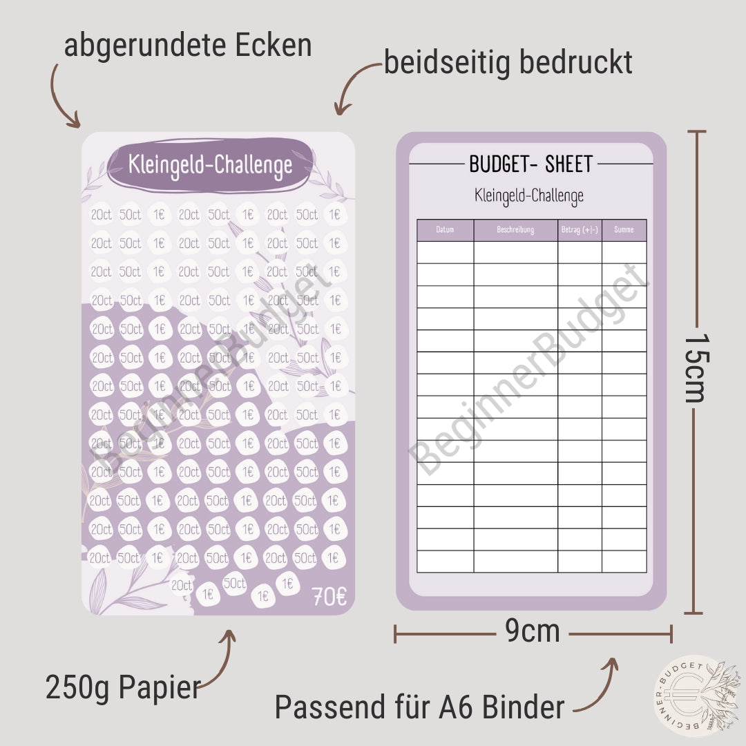 Die Challenge wird auf hochwertigen 250g Papier gedruckt und passend für die Zipperumschläge in deinem Budget Binder Personal zurechtgeschnitten (ca. 9x15cm).