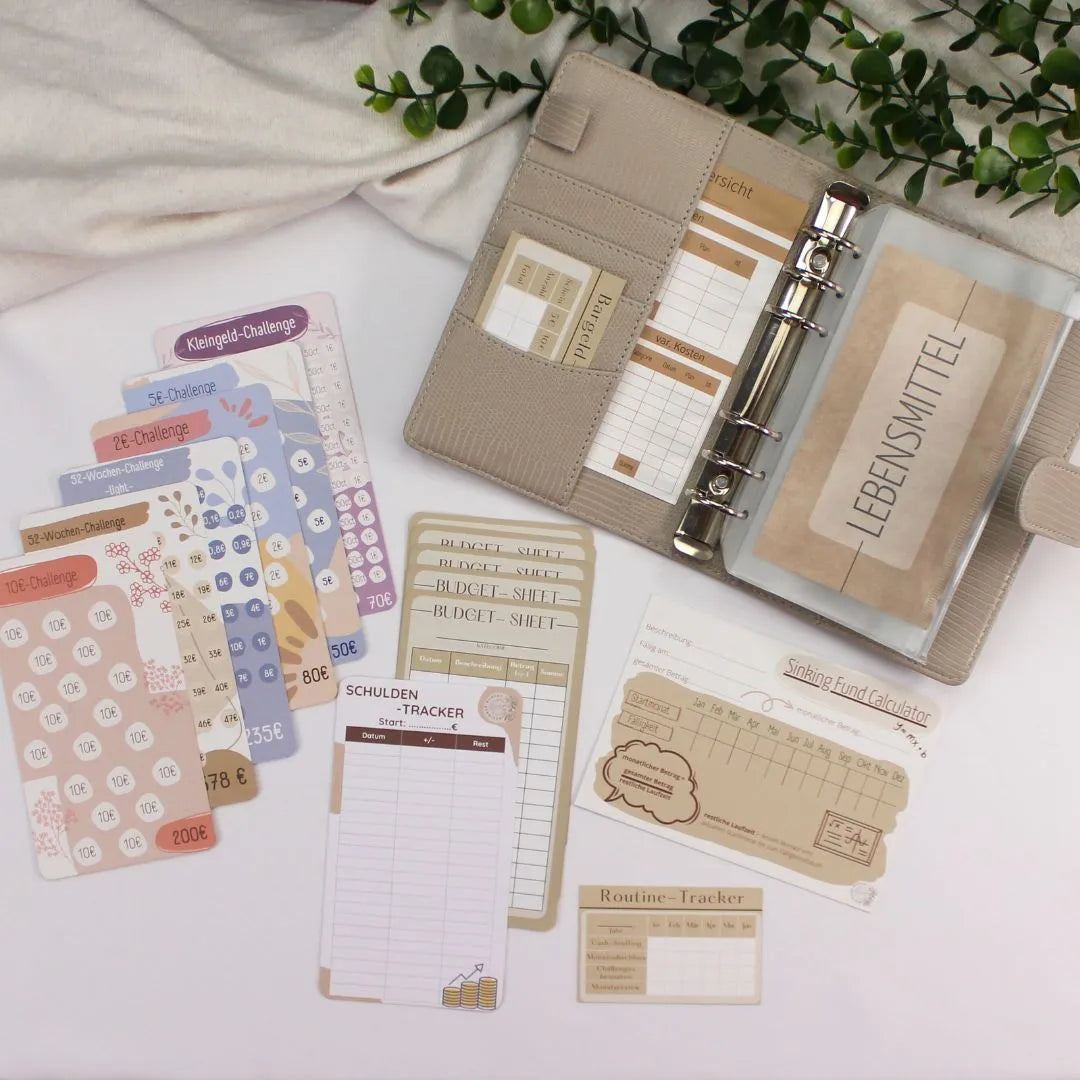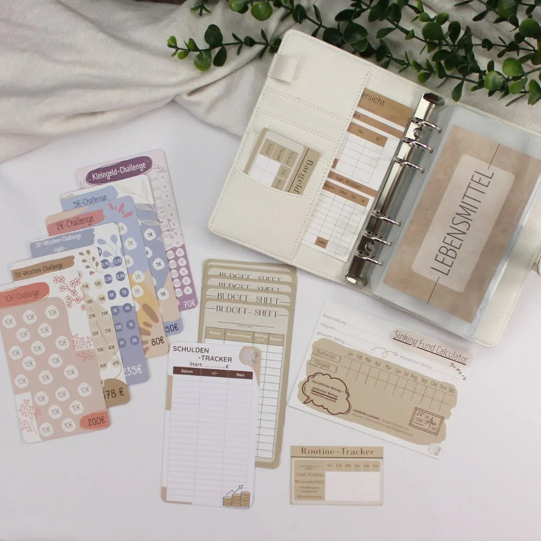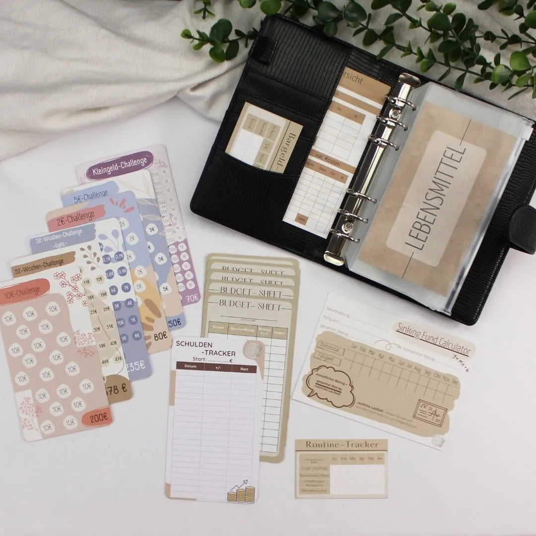 Starte deine Finanzorganisation mit unserem Budget Binder Starter-Set! Dieses Set ist ideal für Einsteiger in die Umschlagmethode und enthält alles Nötige: eine Budgetübersicht, einen Budget Tracker, einen Bargeld Tracker sowie praktische Dashboards. Mit unseren sechs verschiedenen Spar-Challenges setzt du effektive Sparziele und verbesserst dein Geldmanagement. Ob du deine persönlichen Finanzen strukturieren oder Geld sparen möchtest, unser Starter-Set bietet die perfekte Grundlage für effizientes Sparen und Budgetplanung. Mach den ersten Schritt zur finanziellen Freiheit!