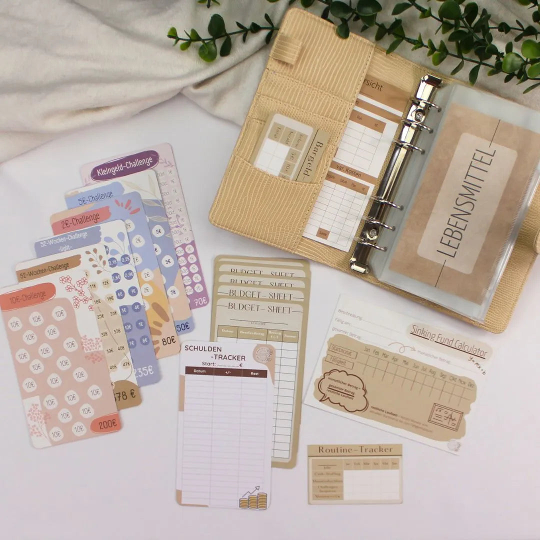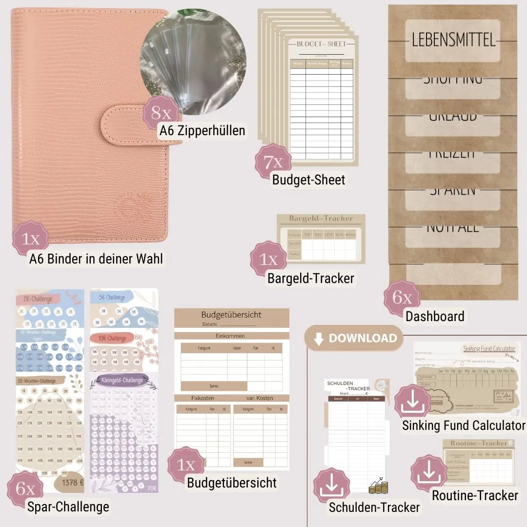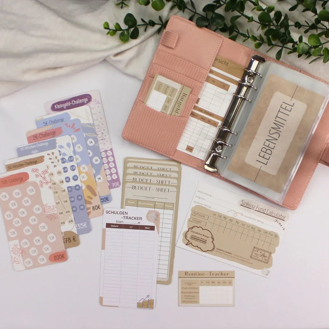 Starte deine Finanzorganisation mit unserem Budget Binder Starter-Set! Dieses Set ist ideal für Einsteiger in die Umschlagmethode und enthält alles Nötige: eine Budgetübersicht, einen Budget Tracker, einen Bargeld Tracker sowie praktische Dashboards. Mit unseren sechs verschiedenen Spar-Challenges setzt du effektive Sparziele und verbesserst dein Geldmanagement. Ob du deine persönlichen Finanzen strukturieren oder Geld sparen möchtest, unser Starter-Set bietet die perfekte Grundlage für effizientes Sparen und Budgetplanung. Mach den ersten Schritt zur finanziellen Freiheit!