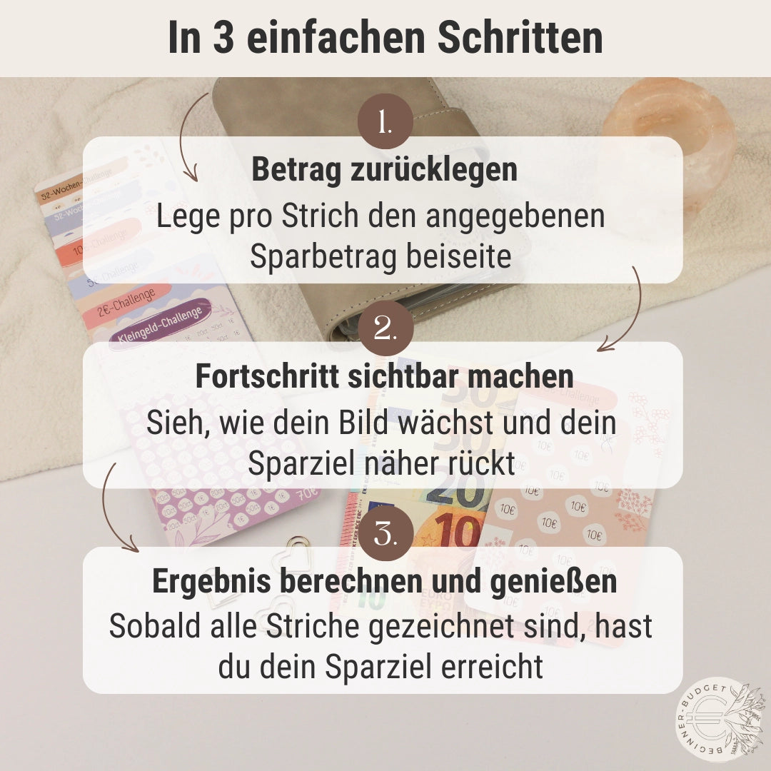 Du möchtest in den Urlaub fahren oder dir das neue iPhone kaufen? Mit dieser Spar-Challenge kommst du deinem Ziel näher und wirst spielerisch zum Sparfuchs. Unten rechts siehst du sofort welche Summe auf dich wartet, wenn du durchhältst. Du kannst durch den Umschlag förmlich zusehen, wie dein Geld mehr wird und du sparst mit der Challenge insgesamt 380€ an.