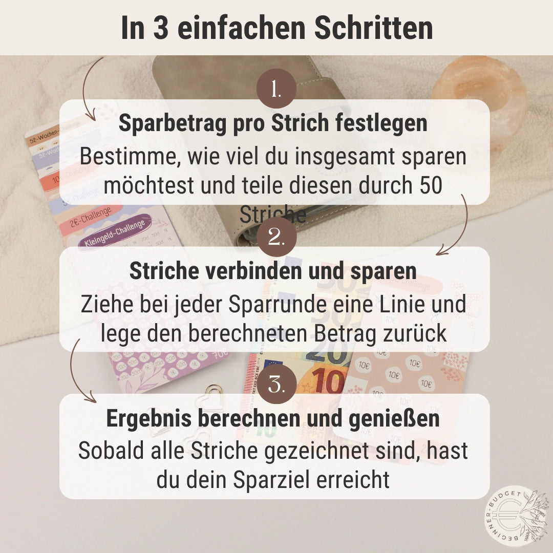 Du möchtest in den Urlaub fahren oder dir das neue iPhone kaufen? Mit dieser Spar-Challenge kommst du deinem Ziel näher und wirst spielerisch zum Sparfuchs. Unten rechts siehst du sofort welche Summe auf dich wartet, wenn du durchhältst. Du kannst durch den Umschlag förmlich zusehen, wie dein Geld mehr wird und du sparst mit der Challenge insgesamt 250€ an.