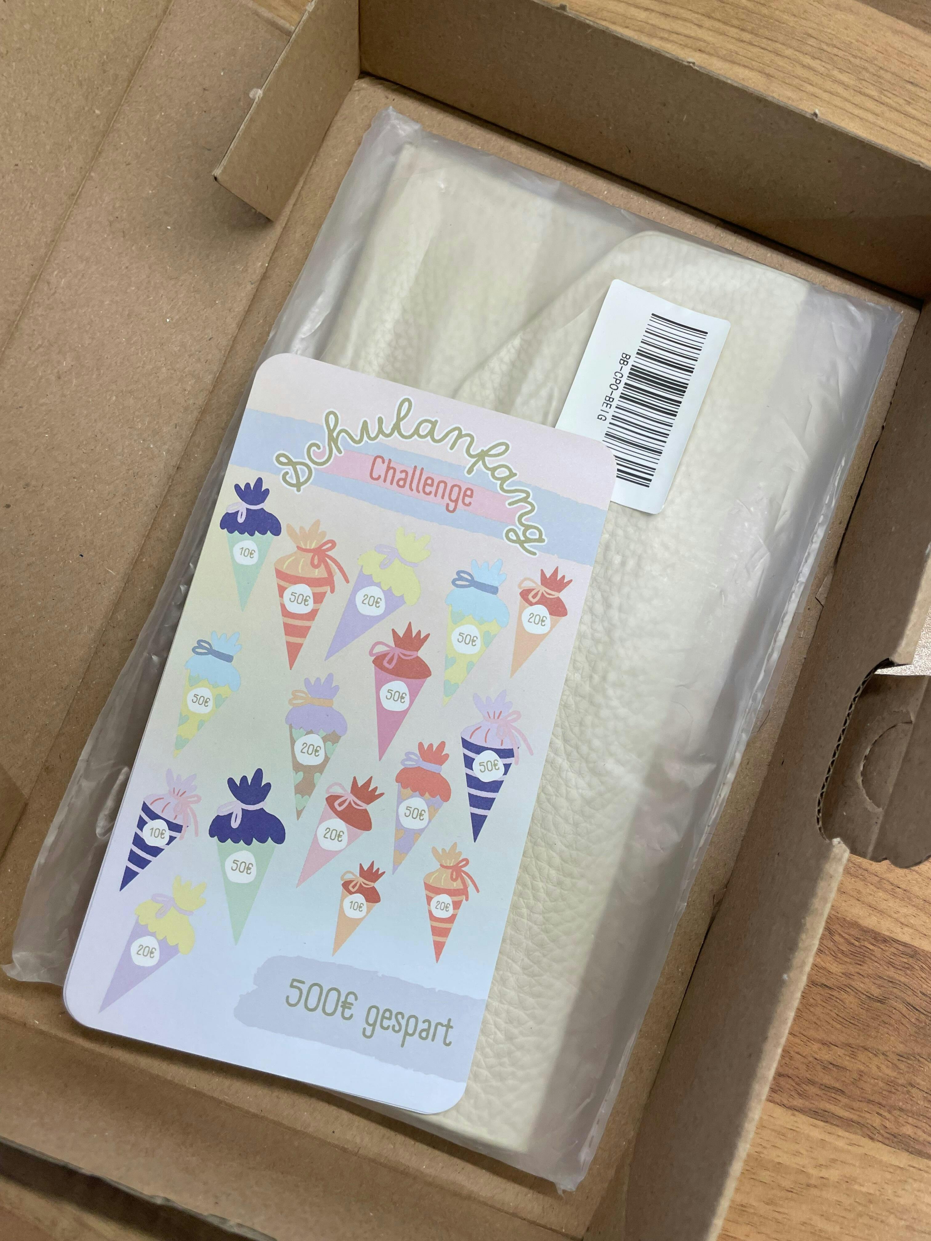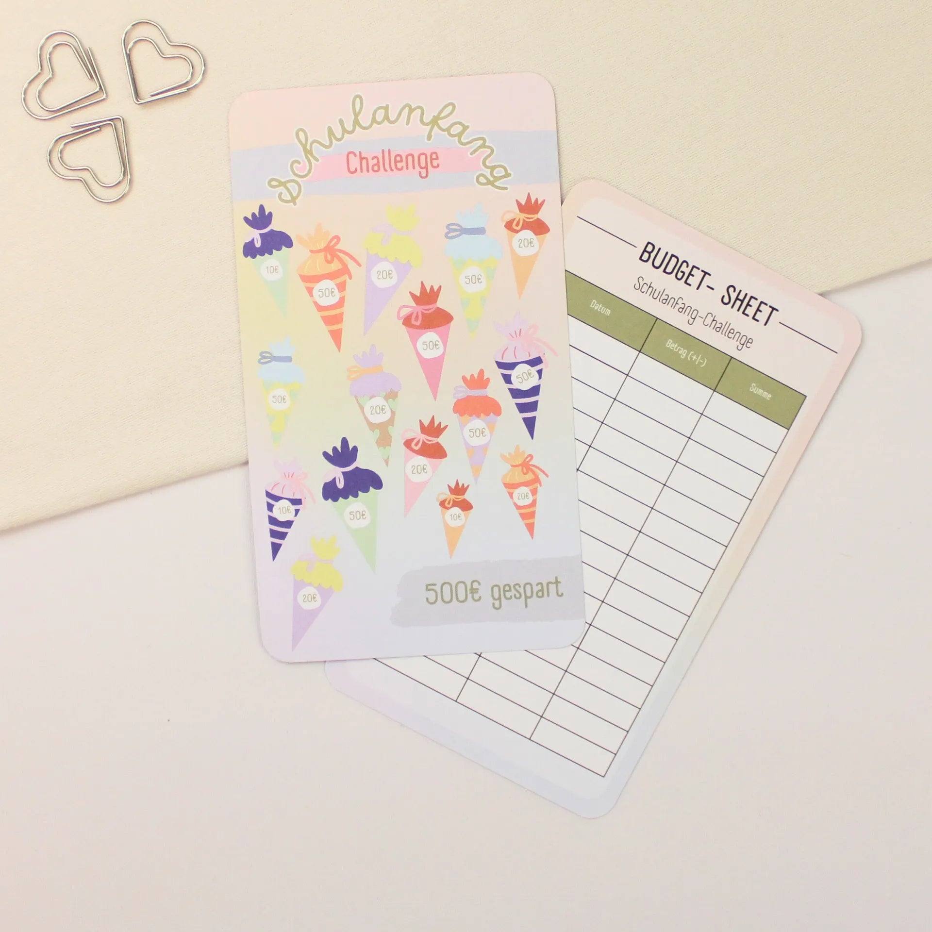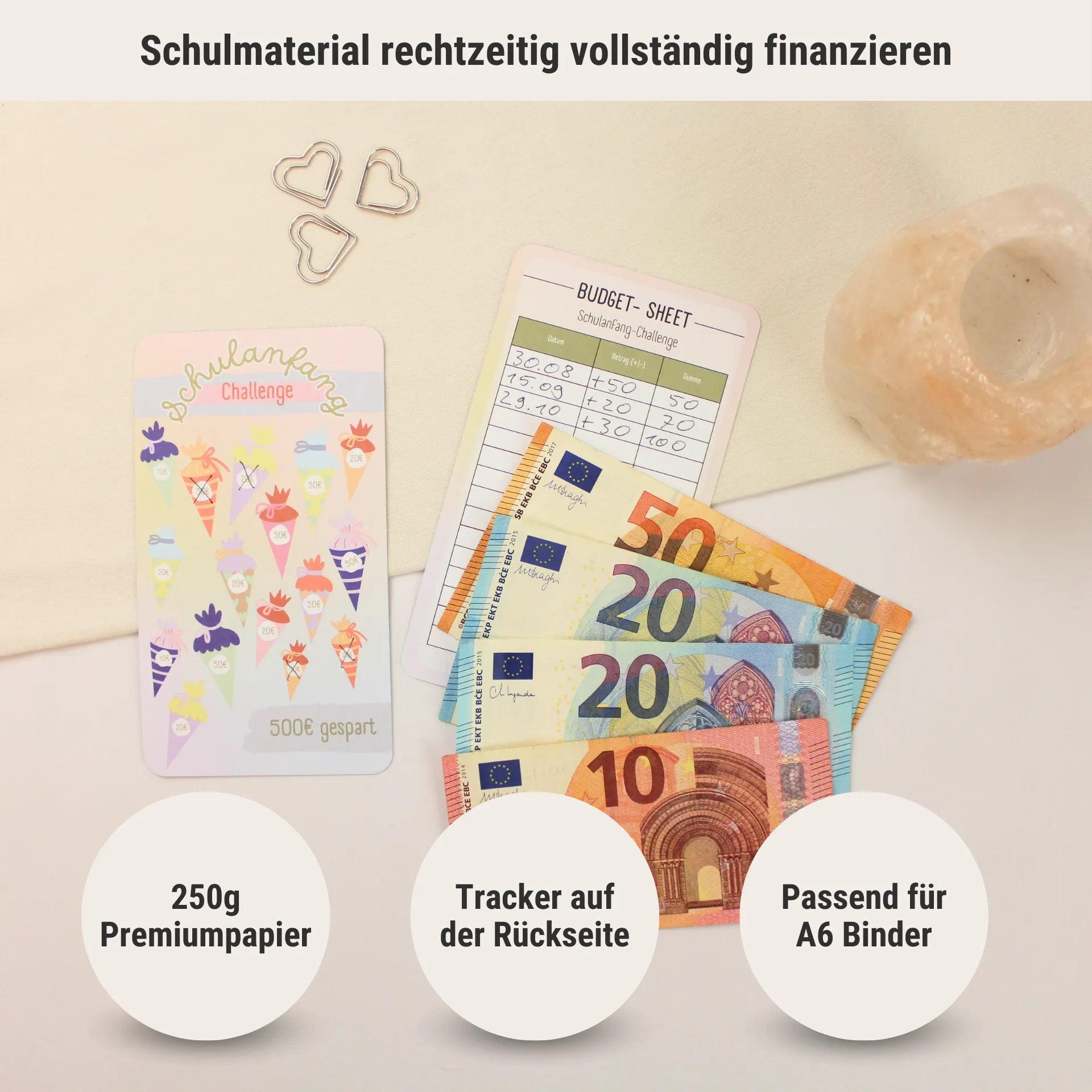 Mit dieser Challenge sparst du ganz entspannt 500 € für den Schulstart – ideal für Ranzen, Hefte & Co. Gedruckt auf 250g Papier mit abgerundeten Ecken und Budget Tracker auf der Rückseite.